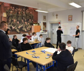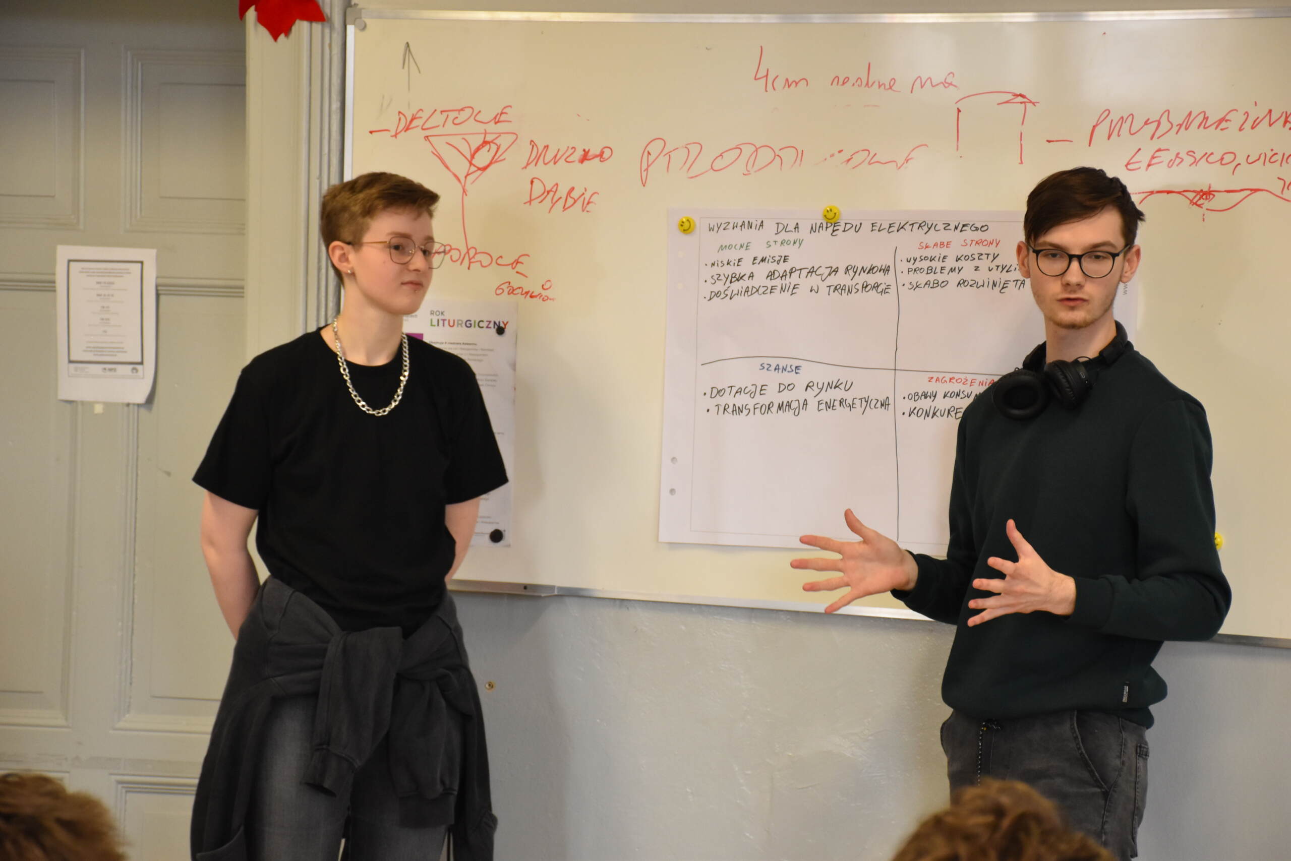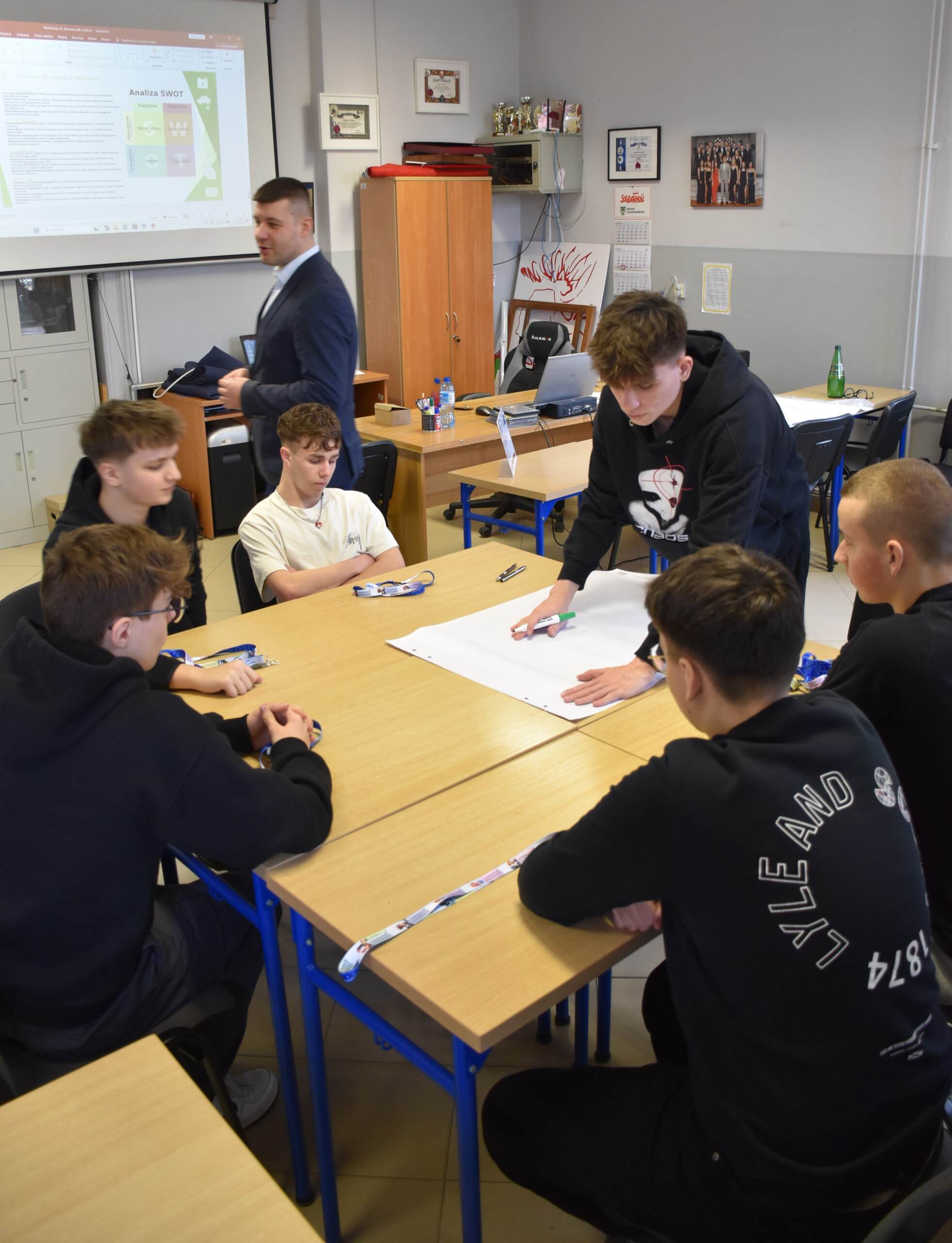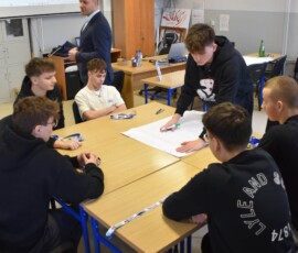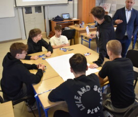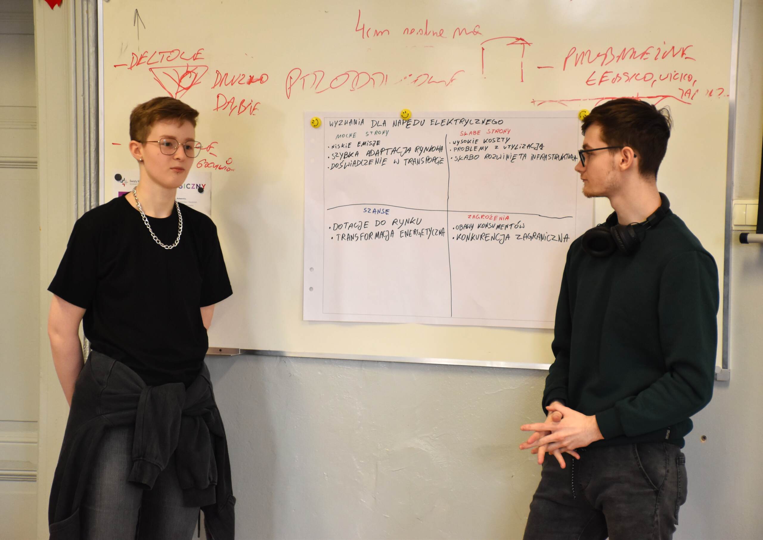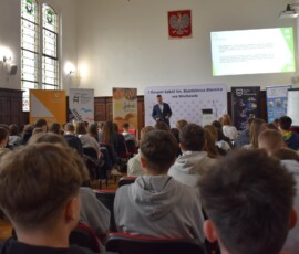 Następnie dr Marek Jaskólski wygłosił prelekcję pt. „Elektromobilność – fakty, mity, geneza i potencjał”, przedstawiając temat w szerokim i praktycznym ujęciu. Część teoretyczna została uzupełniona warsztatami, podczas których uczniowie analizowali szanse i zagrożenia elektromobilności metodą SWOT.