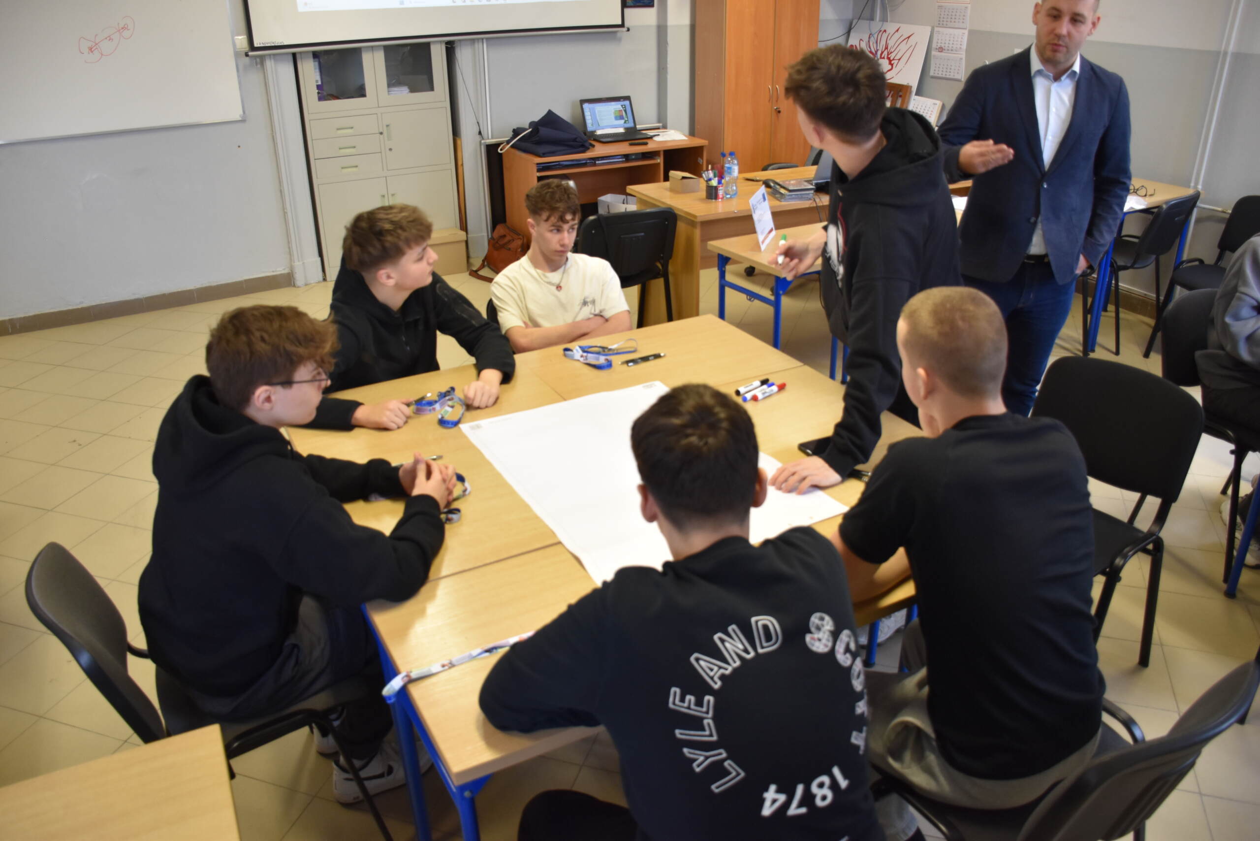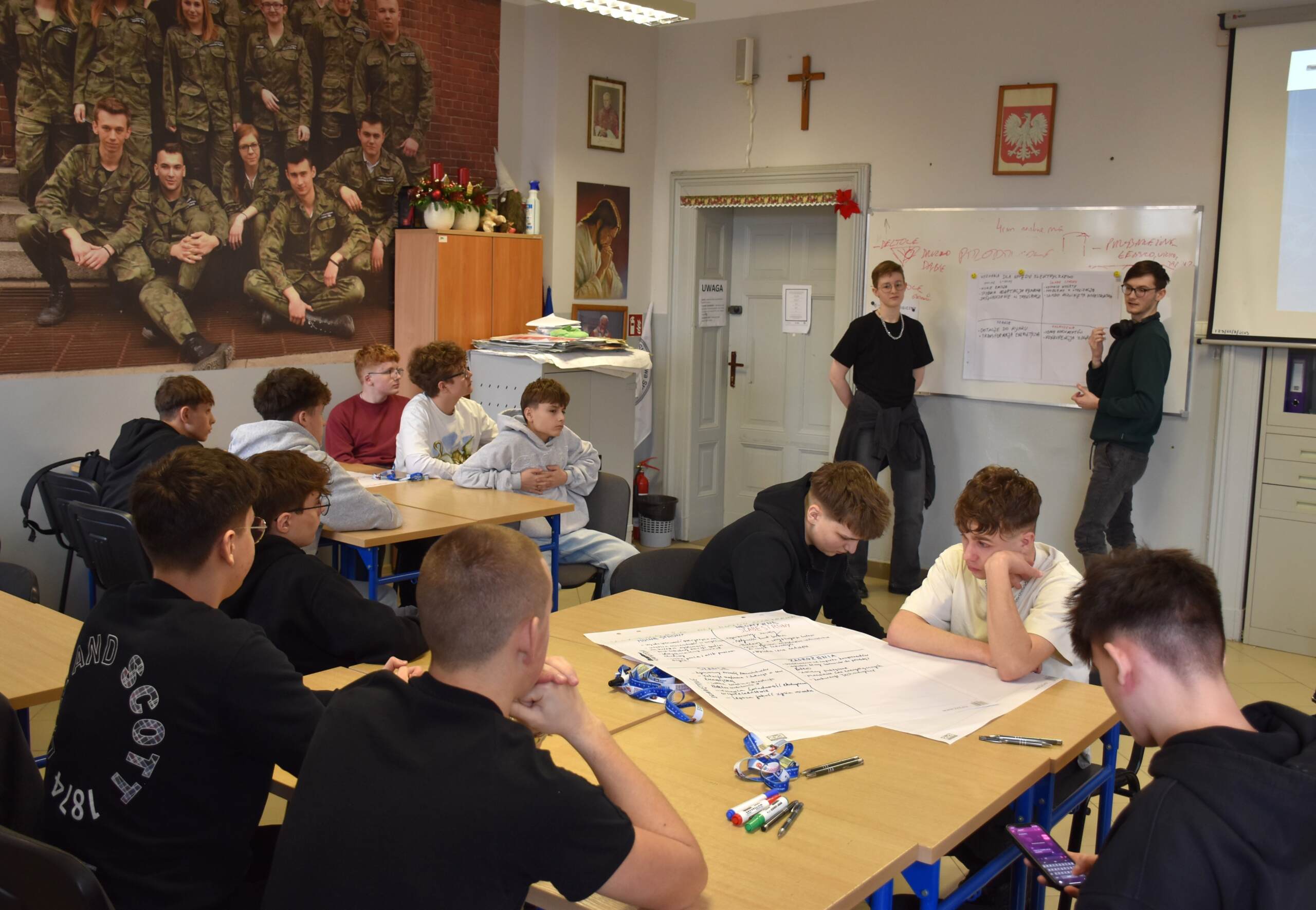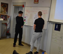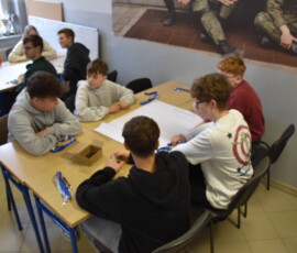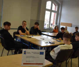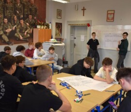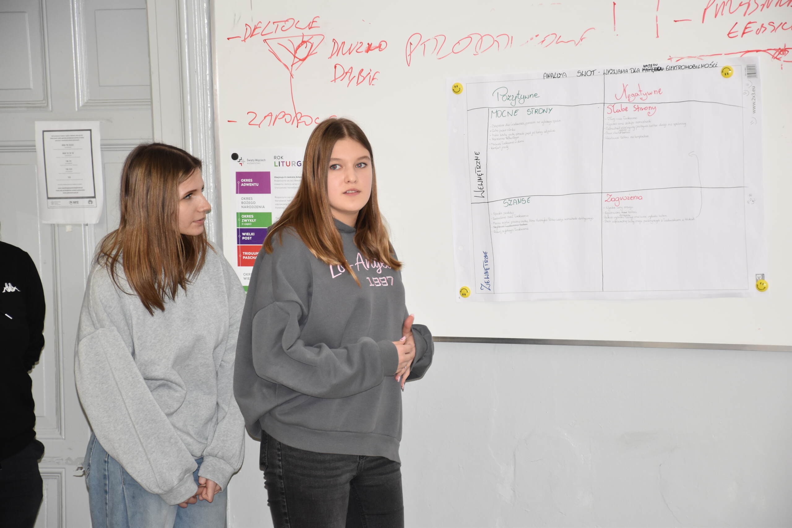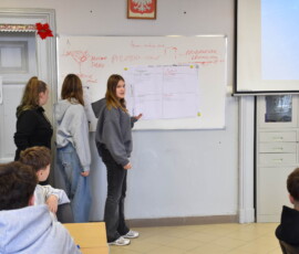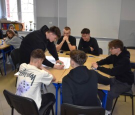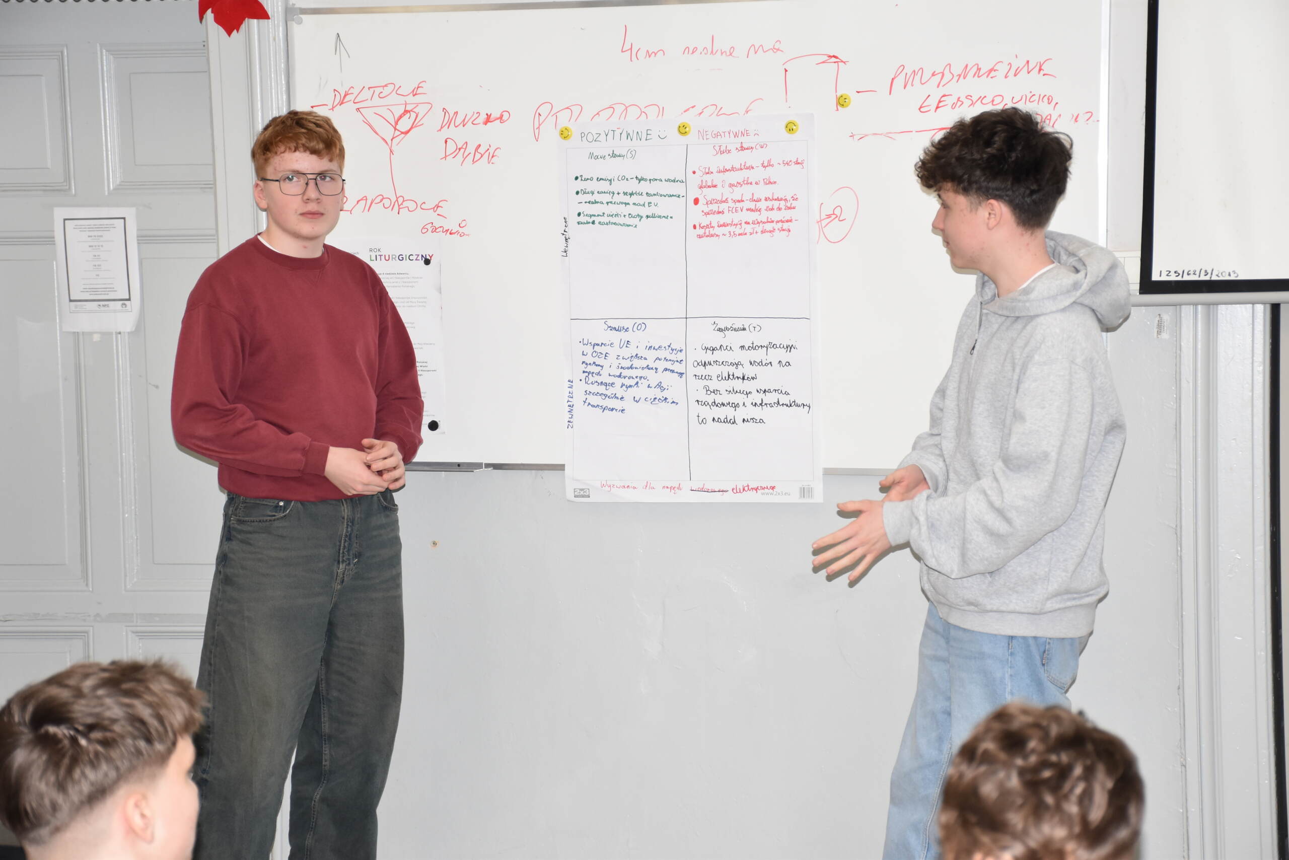 Następnie dr Marek Jaskólski wygłosił prelekcję pt. „Elektromobilność – fakty, mity, geneza i potencjał”, przedstawiając temat w szerokim i praktycznym ujęciu. Część teoretyczna została uzupełniona warsztatami, podczas których uczniowie analizowali szanse i zagrożenia elektromobilności metodą SWOT.